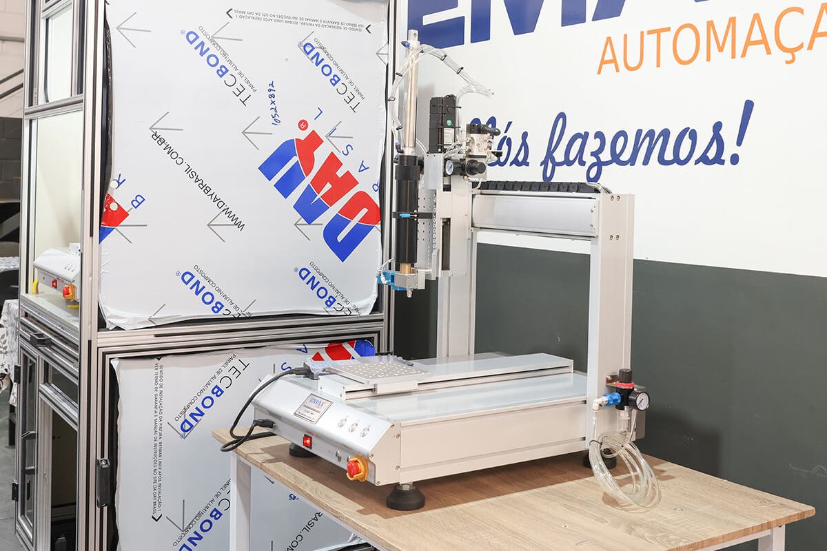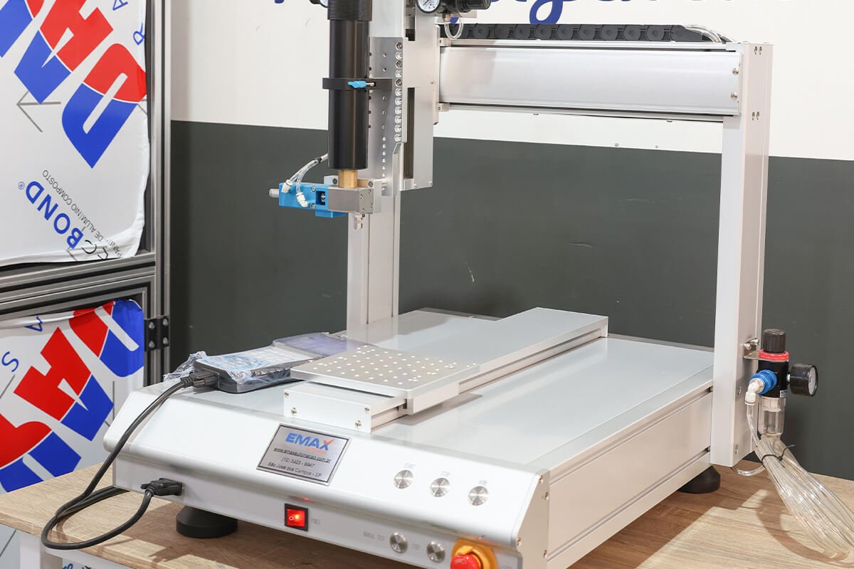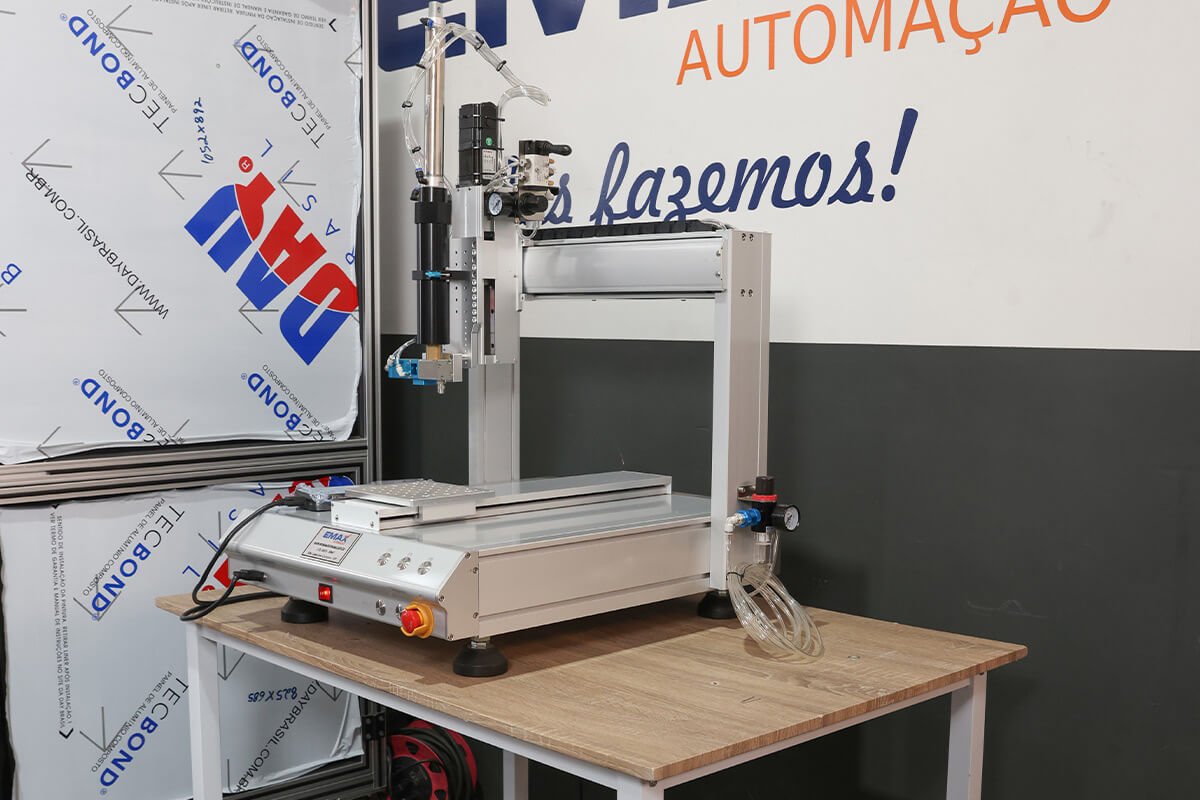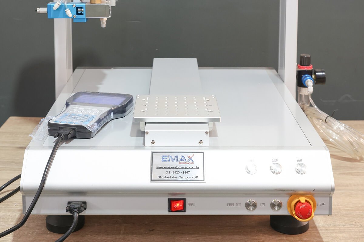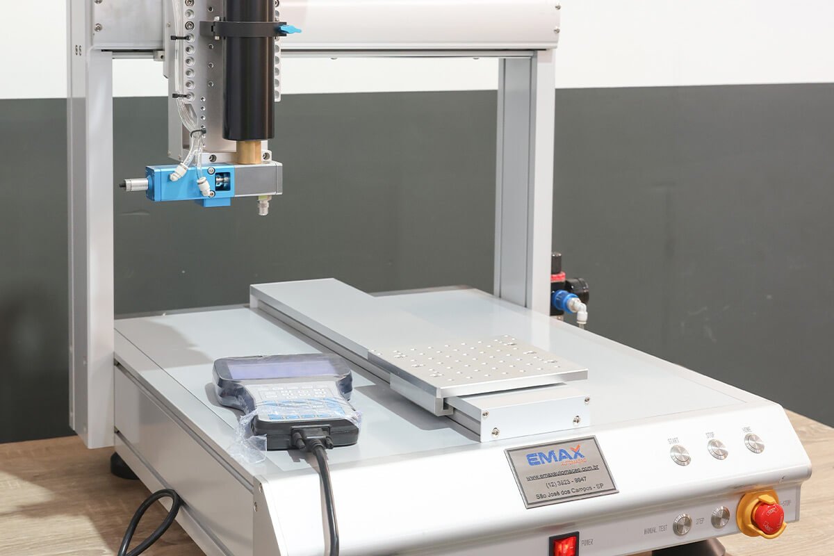 A Emax Automação oferece o Robô Dosador, uma solução para automação da aplicação de cola, com ajuste de volume, espessura, velocidade e tempo de dispensação, além de uma variedade de ponteiras, seringas, válvulas e controles disponíveis para atender a diferentes necessidades.
